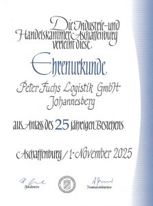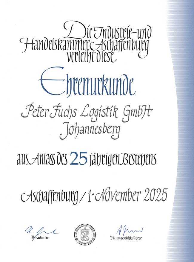 Anlässlich unseres Jubiläums wurde die Fuchs Logistik GmbH für ihren anhaltenden Erfolg und ihr Engagement für die Region von der IHK Aschaffenburg ausgezeichnet.